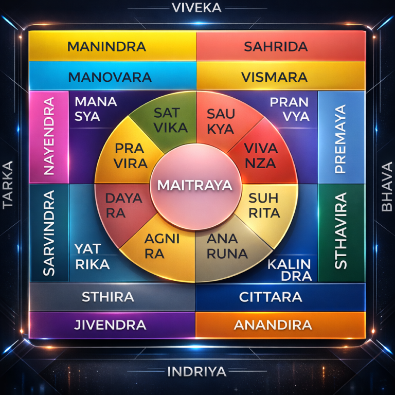 Peta Relasi Persona adalah representasi visual dari seluruh sistem Persona Identika — sebuah mandala kepribadian yang memadukan empat poros utama manusia: Tarka (logika dan penalaran), Viveka (intuisi dan visi), Bhava (emosi dan empati), serta Indriya (indera dan pengalaman nyata). Di antara keempat poros ini, lahirlah 25 tipe kepribadian yang saling terhubung, membentuk keseimbangan antara pemikiran, perasaan, pengamatan, dan kesadaran diri.